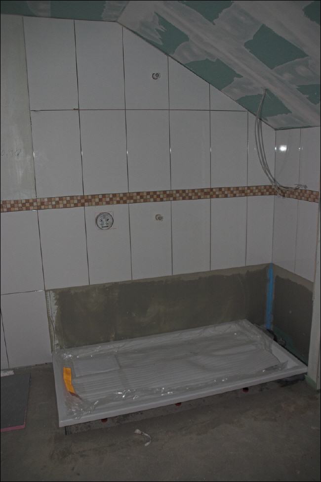Nachdem der Bau nun einige Zeit beheizt wurde, hat seit sich seit zwei Arbeitstagen der Fliesenleger ans Werk gemacht. Mit der Arbeit und vor allem auch den ausgesuchten Fliesen sind wir sehr zufrieden. Einige Kleinigkeiten müssen allerdings doch korrigiert werden, da wir uns das ein oder andere doch anders vorgestellt haben. |