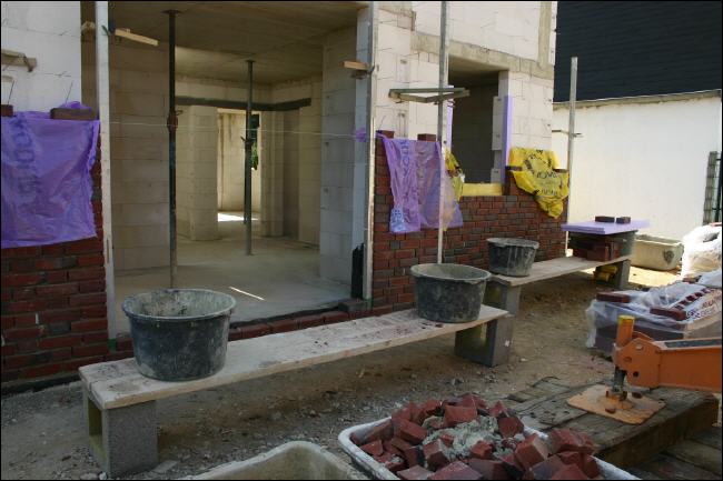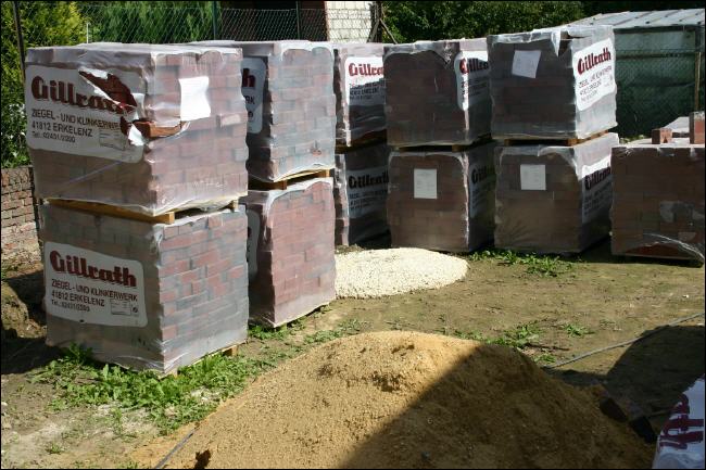 Nun werden doch die Verblendsteine angeliefert und mit den Arbeiten wurde begonnen -- sogar Samstags wird gearbeitet! Wir freuen uns -- aber was ist mit den zwei Wochen "Leerlauf"....? |
