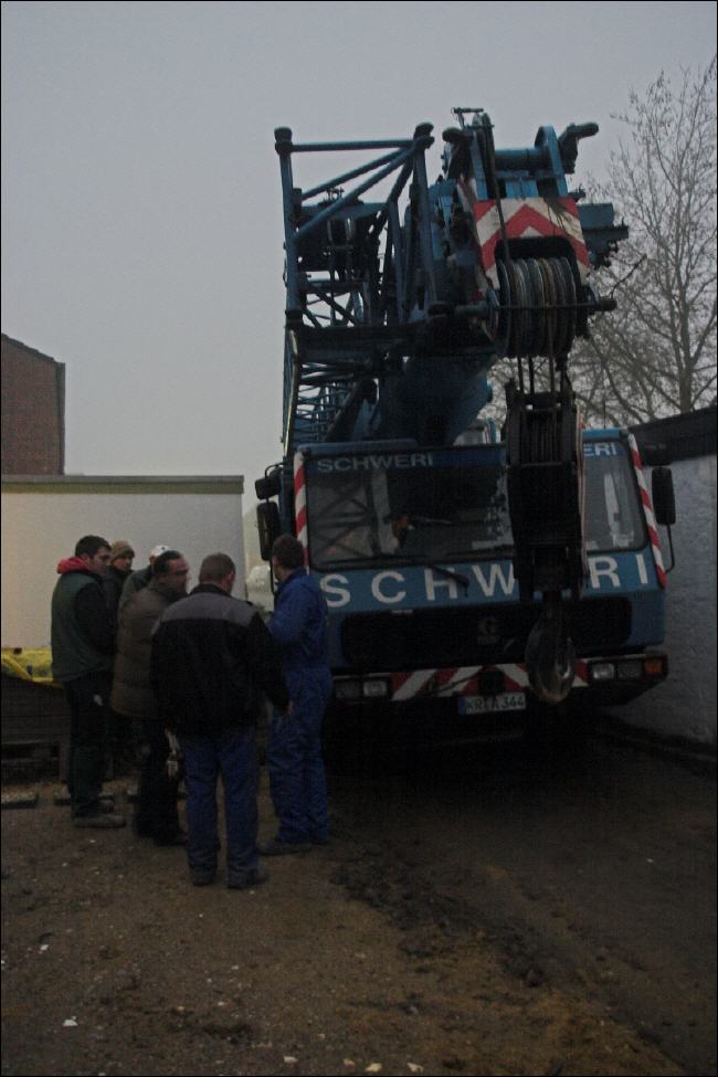 Zunächst war es etwas schwierig, den 60-Tonnen-Koloss durch die schmale Einfahrt zu bugsieren... |