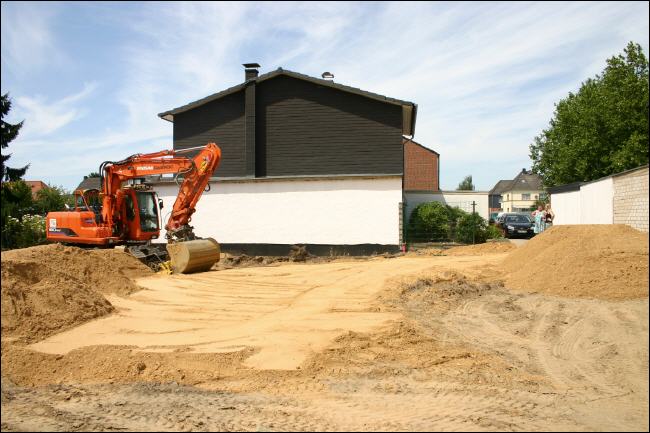 Der Bagger rückt an und entfernt zunächst alle auf dem Grundstück befindlichen Wurzeln. Im Vorfeld haben wir etwa 20 Bäume fällen lassen müssen, die direkt oder indirekt den Bau behindert hätten. Im Nachhinein haben wir und unsere Nachbarn Glück gehabt: einige Bäume erwiesen sich also so morsch, dass sie bei einem der nächsten Stüme umgekippt wären. |
